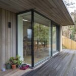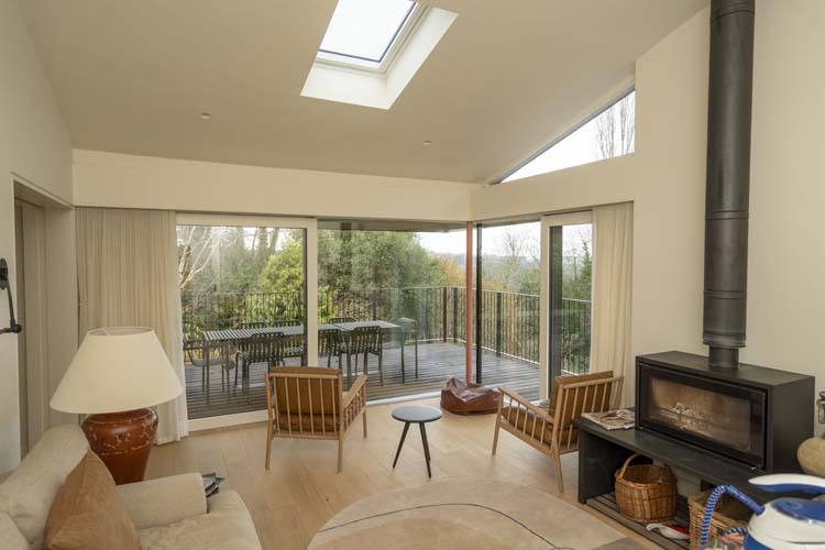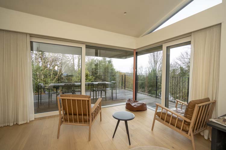 When closed, the glazing forms a striking architectural corner that frames the surrounding landscape. When opened, the corner of the room can be completely opened to the outside, creating a seamless transition between the interior living space and the wrap-around timber terrace.