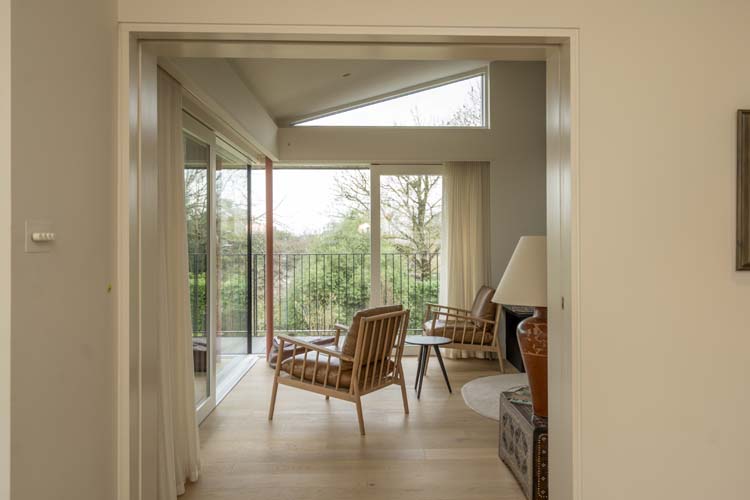 The glazing also strengthens the architectural relationship between the interior and the surrounding landscape. From inside the house, the terrace and gardens appear as a continuation of the living space, creating a calm and open atmosphere within the home.