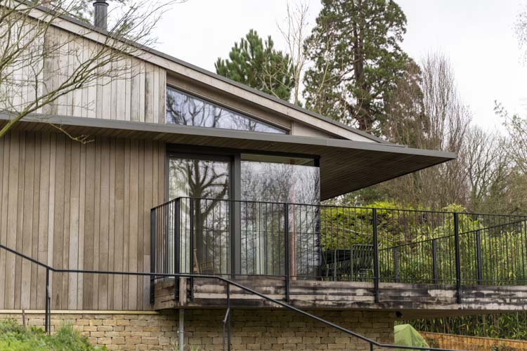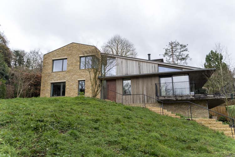 This approach enhances the panoramic views across the valley and woodland beyond while allowing natural light to flood the interior spaces.